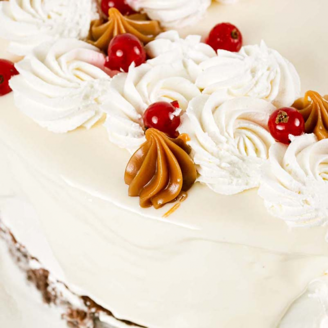 Elegant și discret, datorită aspectului ce îl oferă glazura de ciocolată și decorurile fine ce înfrumusețează tortul, savuros și impresionant, datorită conținutului de cremă de frișcă cu mascarpone combinată cu fructe, acest tort este unul fresh și ușor, crema fiind una spumoasă cu note acrișoare, echilibrată cu ajutorul blatului de cacao.