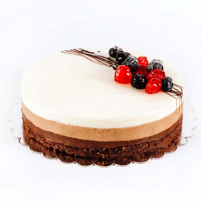 Iubitorii de ciocolată vor adora acest tort, având în compoziție trei feluri de ciocolatăa căror aroma este accentuată prin realizarea cremei sub formă de mousse de ciocolată neagră, mousse de ciocolată cu lapte și mousse de ciocolată albă. Tortul e savuros și ușor datorită mousse-uluidar și datorită fructelor care decorează tortul.